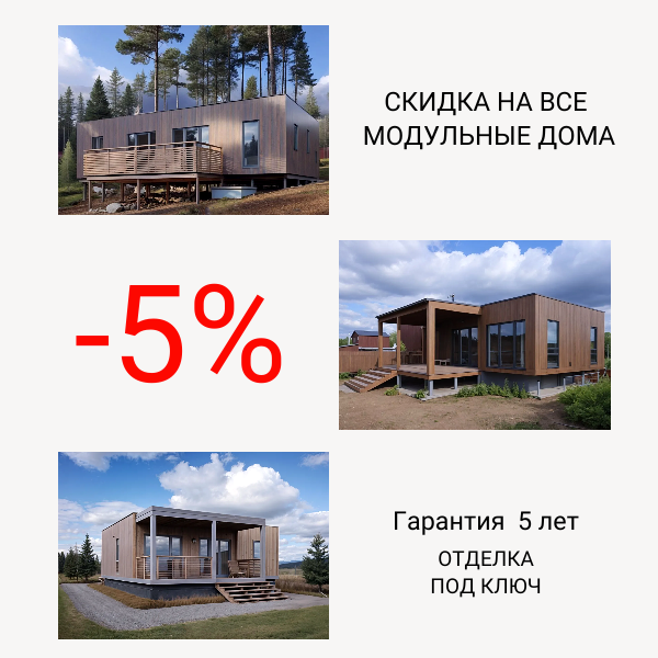 В акции участвуют все наши модульные дома. Успейте заключить договор по сниженной стоимости. Акция действует до ее отмены.